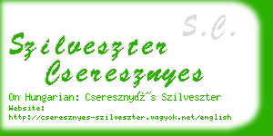 Frequency of SZILVESZTER name and CSERESZNYES surname in HungaryThe Szilveszter name frequency in Hungary: The name is in TOP Eigthy-Six most common man name in Hungary. As 1.st name: 0.0454% (Four Thousand Five Hundred and Thirty-Six), as 2nd name: 0.0183% (One Thousand Eight Hundred and Twenty-Eight) man have this name.. Cseresznyes surname frequency: 6 What English words can be put together from characters of the name?